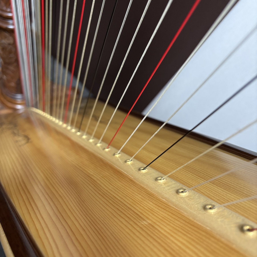 ハープの起源を遡ると石器時代、狩猟に使われた弓に辿り着くとのこと。長〜い歴史を経て現在の形に。グランドハープをよく見ると、かなり複雑な構造マシーン。全ての調性に対応できるよう、1本の弦をペダルで3音程コントールしてます。赤い弦、青(黒)い弦は音階の配列を視覚的に判別しやすくするためです。