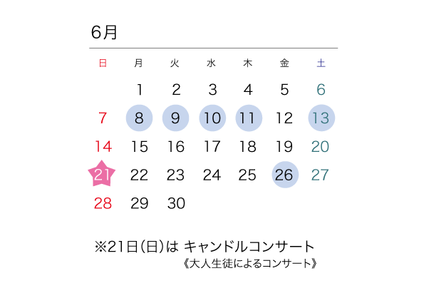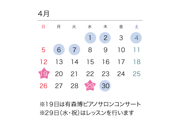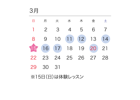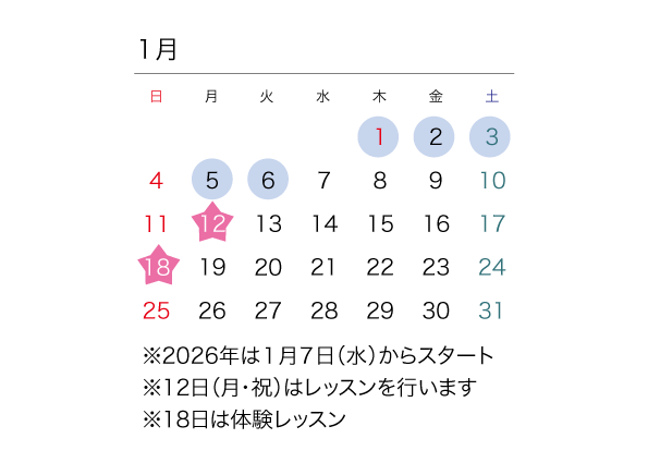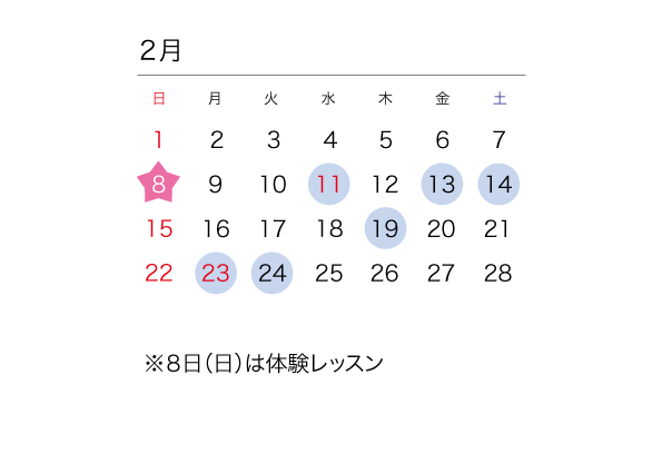 ●ピンクの★印は例外にレッスンを行う日、あるいは体験レッスンなどイベント開催日