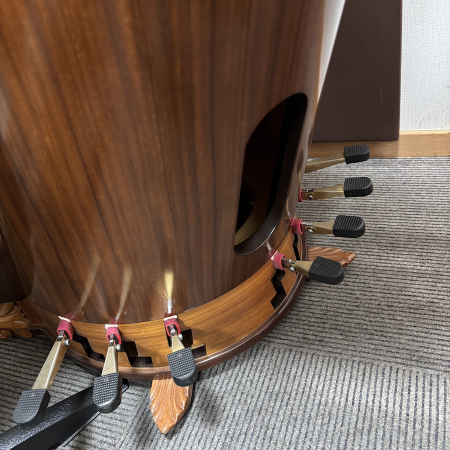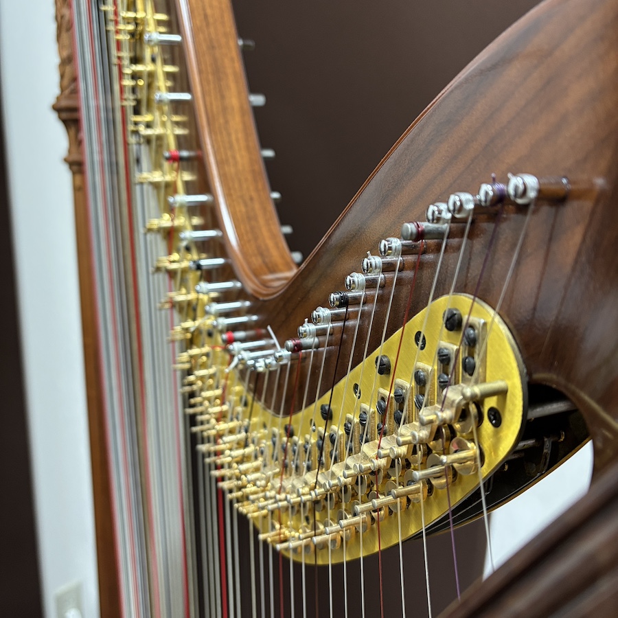 ハープの起源を遡ると石器時代、狩猟に使われた弓に辿り着くとのこと。長〜い歴史を経て現在の形に。グランドハープをよく見ると、かなり複雑な構造マシーン。全ての調性に対応できるよう、1本の弦をペダルで3音程コントールしてます。赤い弦、青(黒)い弦は音階の配列を視覚的に判別しやすくするためです。