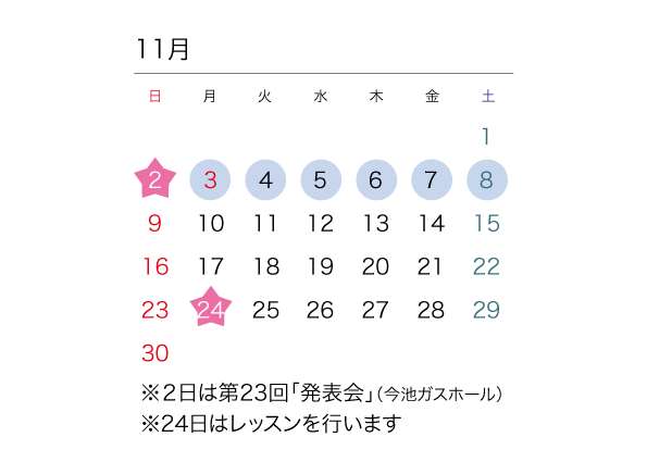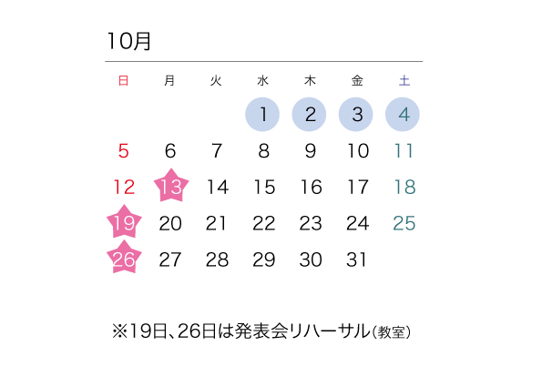 ●ピンクの★印は例外にレッスンを行う日、あるいは体験レッスンなどイベント開催日